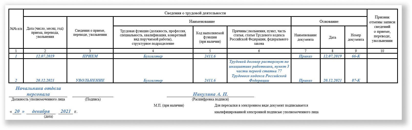 - причина увольнения — вносите запись так же, как делали это в бумажной трудовой книжке: укажите пункт, часть и статью Кодекса или другого ФЗ, ничего не сокращайте;