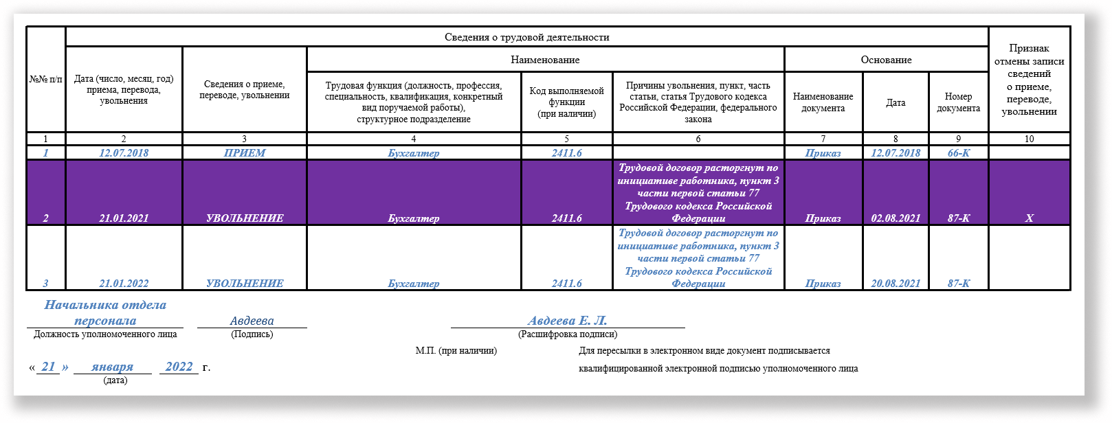 Пример. При подготовке СТД-Р кадровик ошибся и указал неверно день увольнения — вместо 21.01.2022 указал 21.01.2021. Сотрудница обратилась к нему с просьбой исправить неверные сведения. Вот как будет выглядеть новая справка.